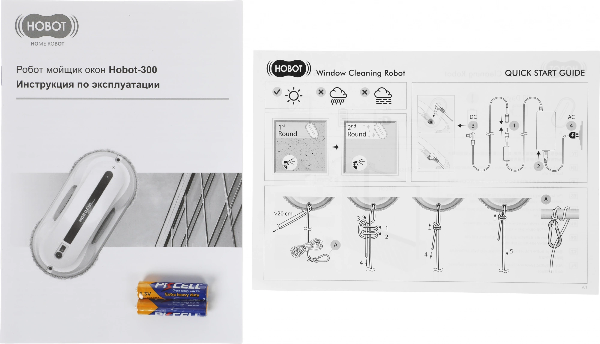 | Комплектация | робот HOBOT-300, страховочный шнур, пульт ДУ, адаптер питания, шнур питания переменного тока, удлинитель постоянного тока, чистящие салфетки из микрофибры (6 шт. + 2 шт. на роботе), кольцо для салфеток (2 шт. + 2 шт. на роботе), руководство пользователя, гарантийный талон |