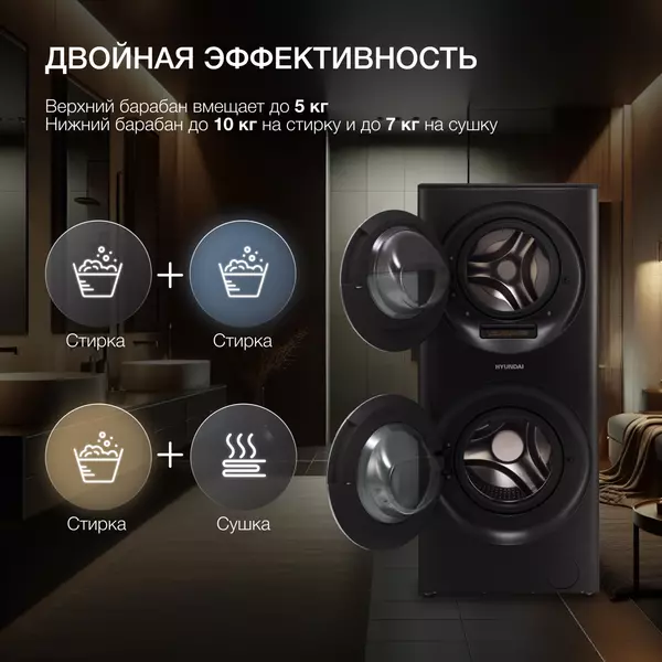 | Дополнительно | Максимальная загрузка верхнего барабана 5 кг, нижнего - 10 кг. Загрузка 15 кг возможна при одновременной стирке в двух барабанах. |