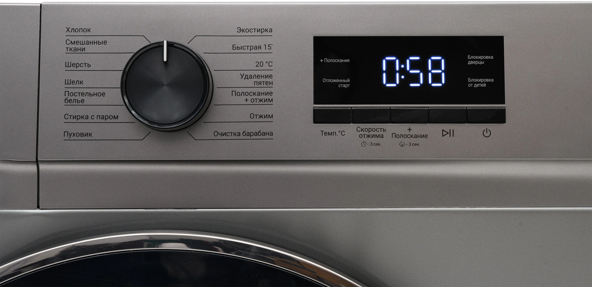 Хлопок, Смешанные ткани, Шерсть, Шелк, Постельное бельё, Стирка с паром, Пуховик, Экостирка, Быстрая 15’, 20°C, Удаление пятен, Полоскание + Отжим, Отжим, Очистка барабана