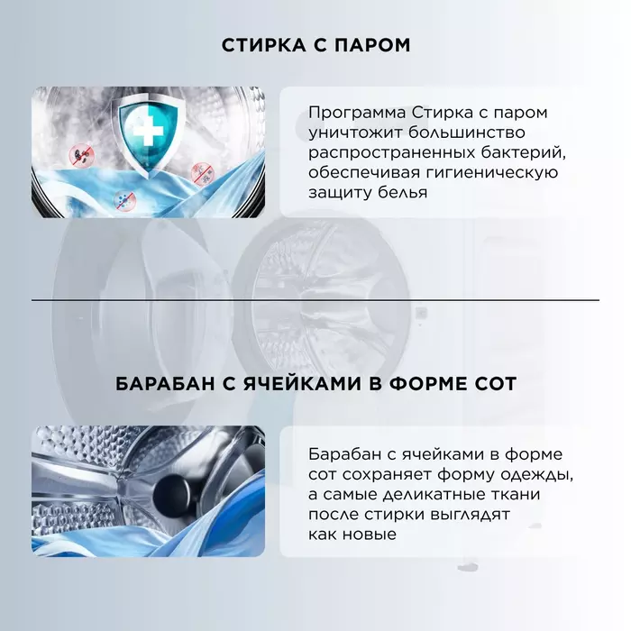 | Программы | Eco, детская одежда, отжим, постельное белье, пуховые изделия, спорт, хлопок, шерсть |