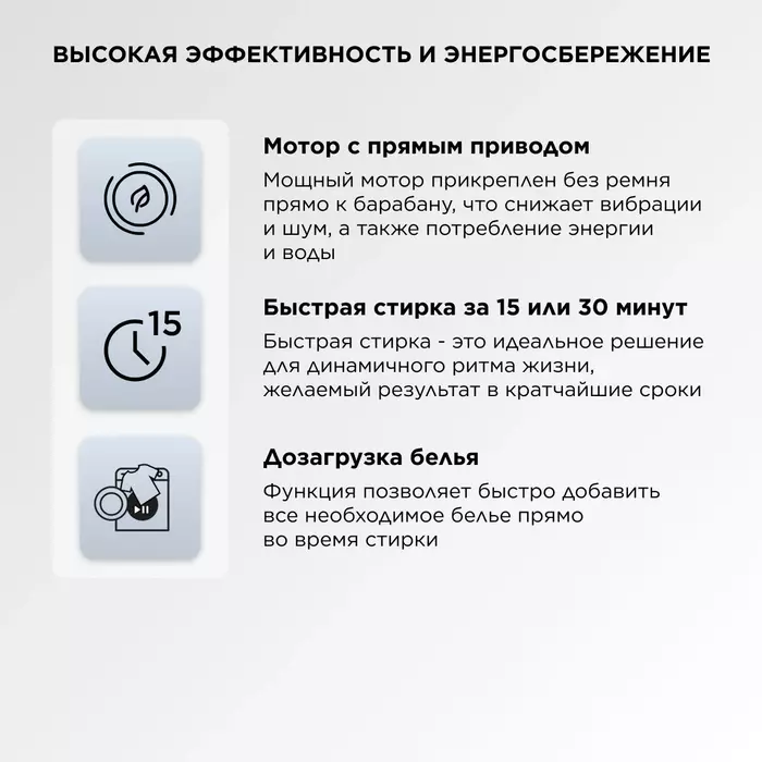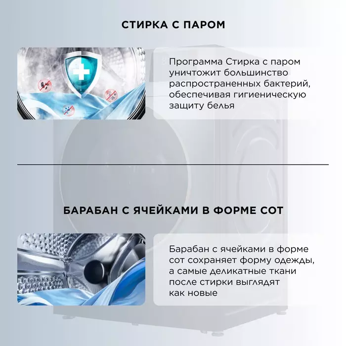 | Безопасность и управление | блокировка от случайного нажатия, дисплей, защита от детей, защита от перегрева, защита от протечек, контроль дисбаланса, контроль уровня пены, отключение звукового сигнала, самодиагностика неисправностей, таймер отсрочки запуска |
