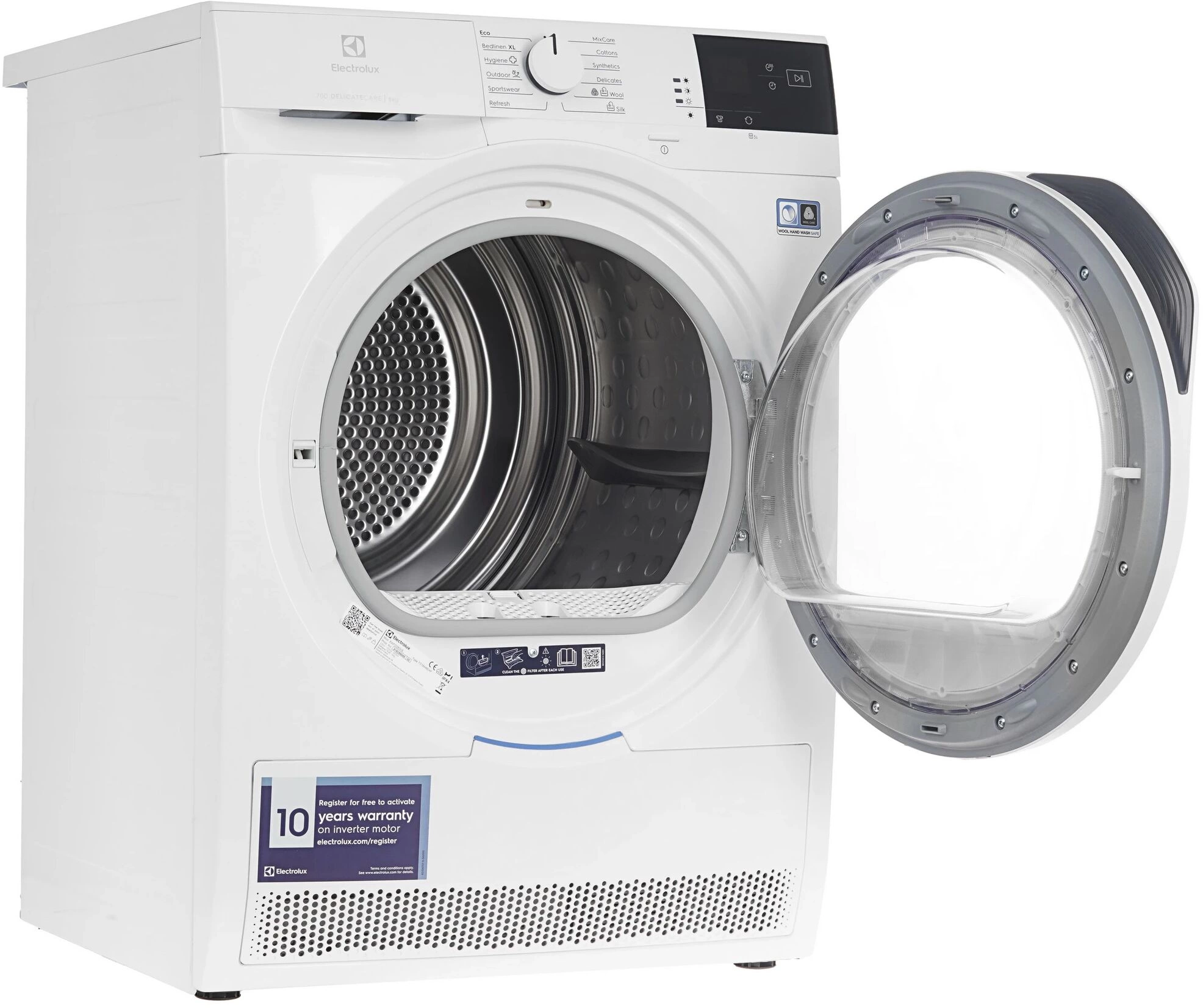 | Программы | Программы для синтетики. Программа для хлопка. Режим «освежить одежду». Шерсть. Шелк. Спортивная одежда. Деликатные ткани. Верхняя одежда. Смешанный режим. Постельное белье XL. |