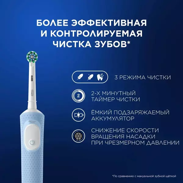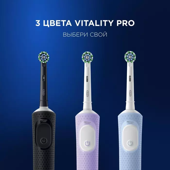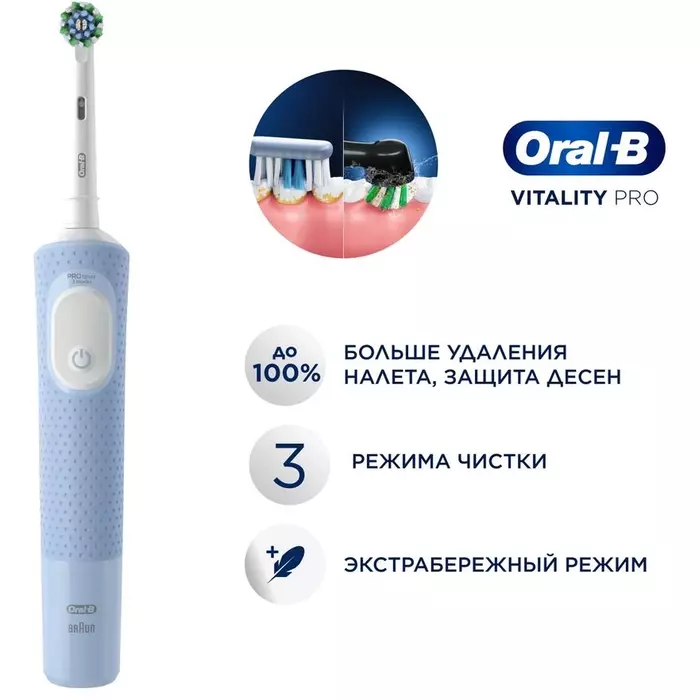 "Электрическая зубная щетка нового поколения Oral-B Vitality PRO обеспечит ощущение профессиональной чистки каждый день и подойдет даже для любителей экстра бережного очищения благодаря уникальному режиму SENSITIVE PLUS. Oral-B Vitality PRO удаляет до 100% больше налета по сравнению с обычной зубной