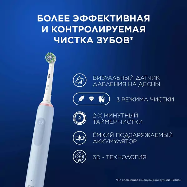 Электрическая зубная щетка нового поколения Oral-B Pro Series 3 обеспечит ощущение профессиональной чистки каждый день. Круглая насадка с технологией щетинок PRO Cross Action, удаляет до 100% больше зубного налета* даже в труднодоступных местах и защищает десны.