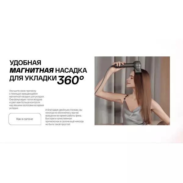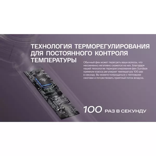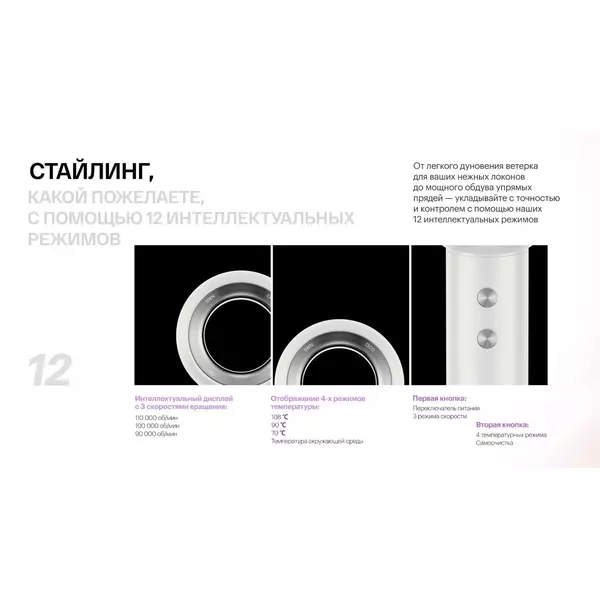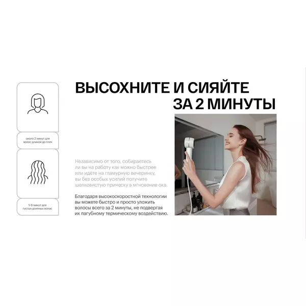 Высокоскоростной фен со скоростью потока 70 м/с, обеспечивает мгновенную сушку волос всего за 2 минуты, 4 температурных режима и 3 режима скорости помогут подстроиться под любой стиль укладки. Стильный и компактный. Бережно сохраняет волосы с 500 млн. негативных ионов и системой терморегулирования