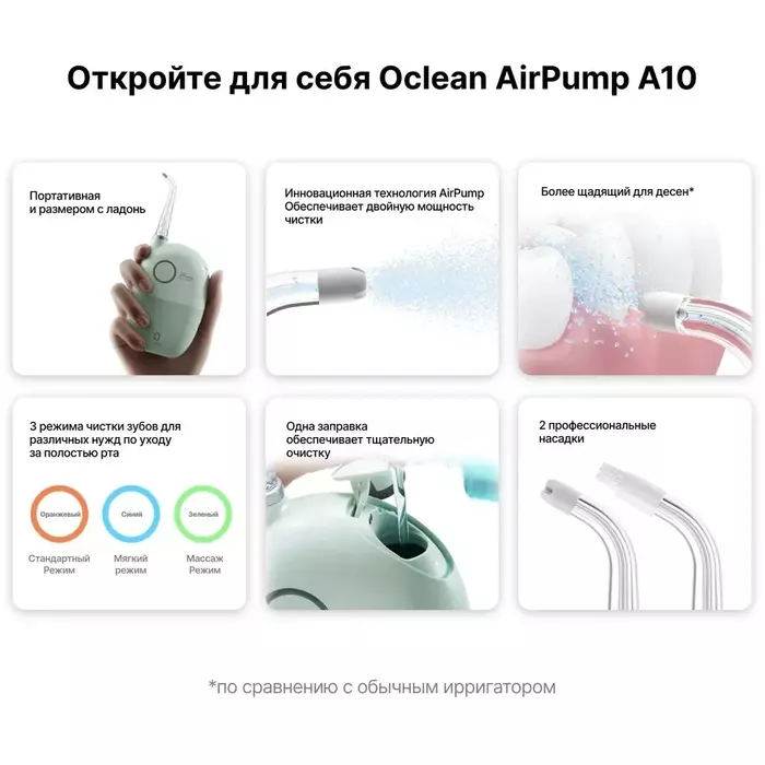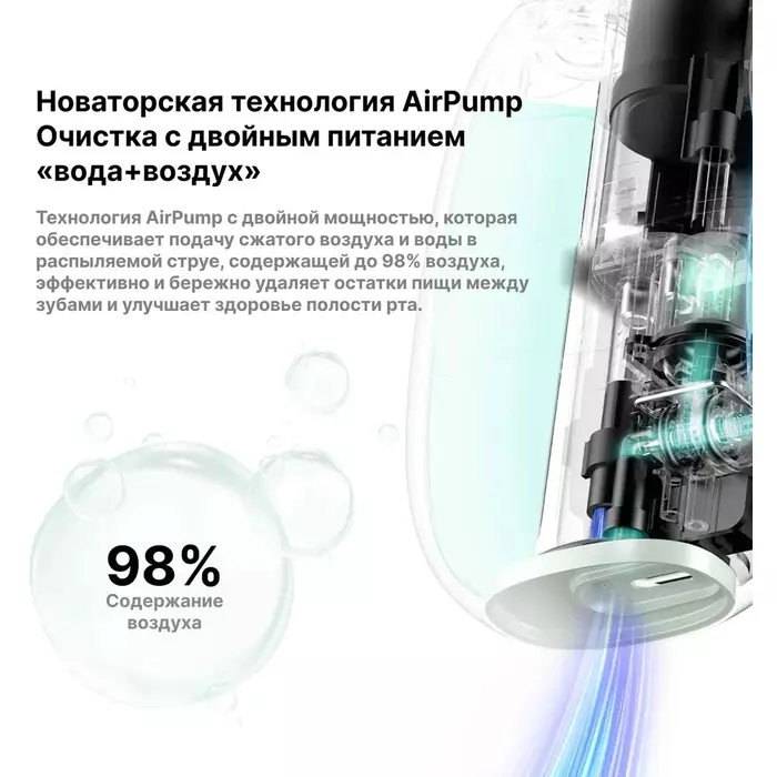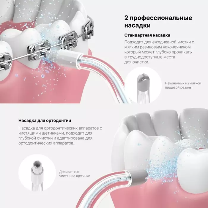 Ультрапортативный ортодонтичческий ирригатор. Технология AirPump dual power использует выброс сжатого воздуха и воды в распыляемой струе, содержащей до 98% воздуха. Это эффективно и бережно удаляет остатки пищи между зубами, улучшая здоровье полости рта. Насдаки - N20, N21 Стандартный режим , Массаж
