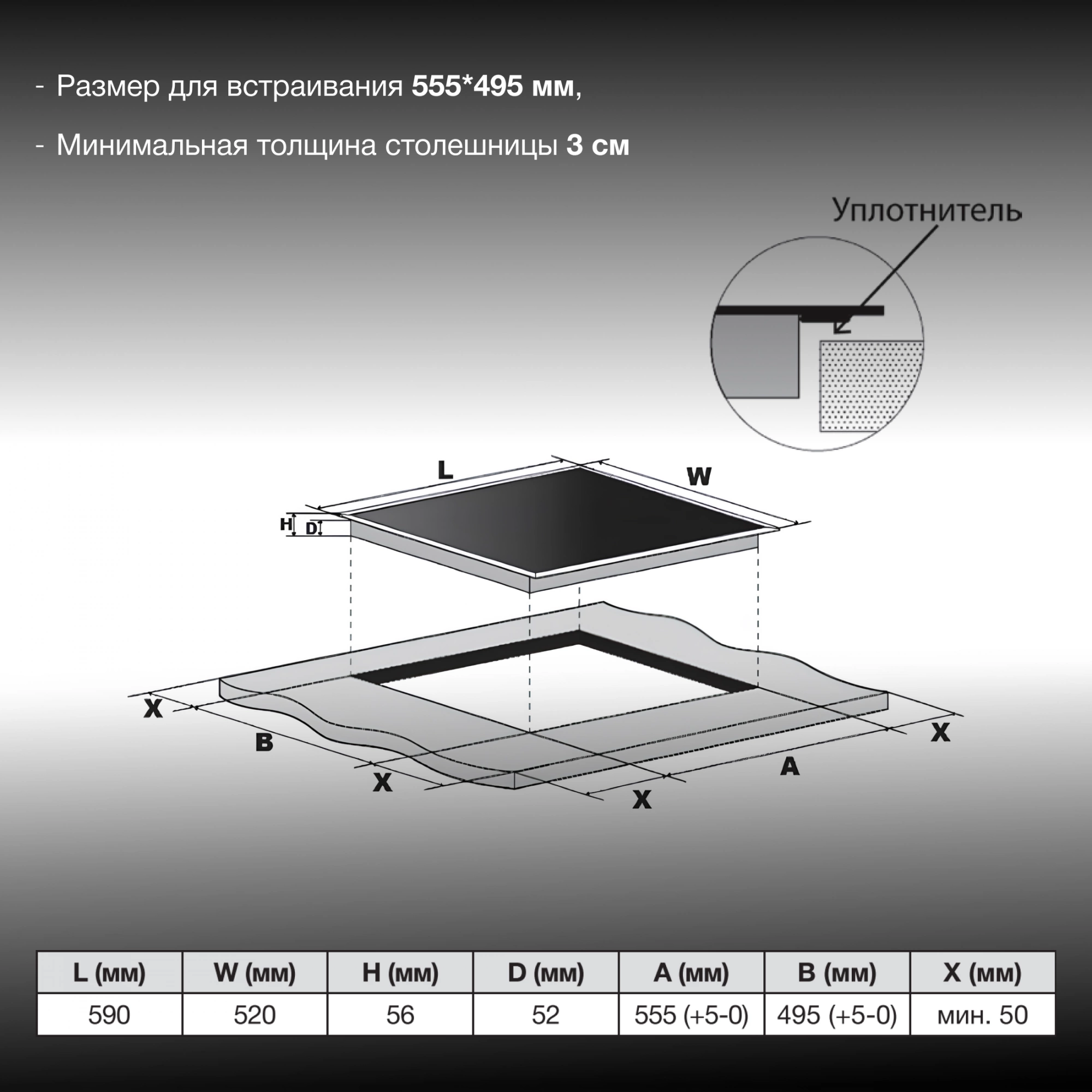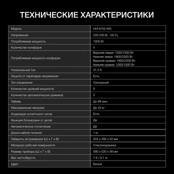 Характеристики Основные характеристики Тип Индукционная варочная поверхность Управление электронное Тип переключателей сенсорные,...