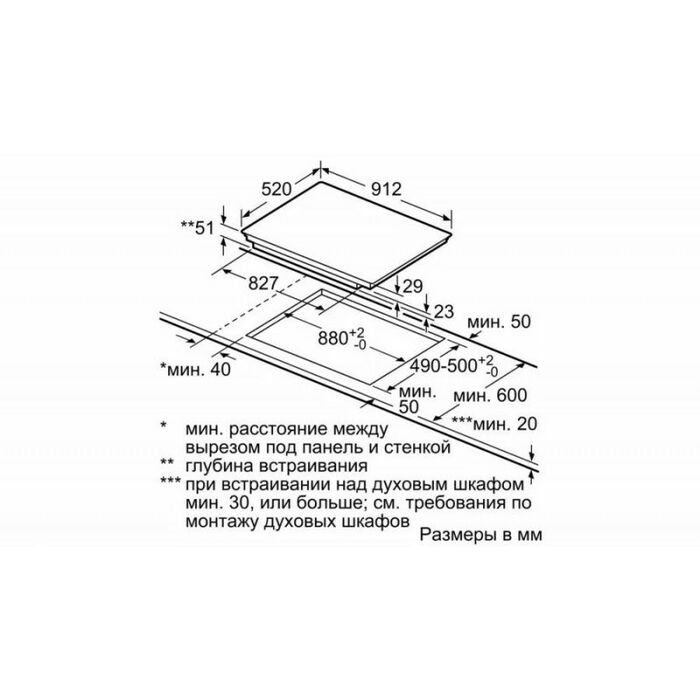 - Размеры ниши для встраивания панели, мм 51 x 880-880 x 490-500