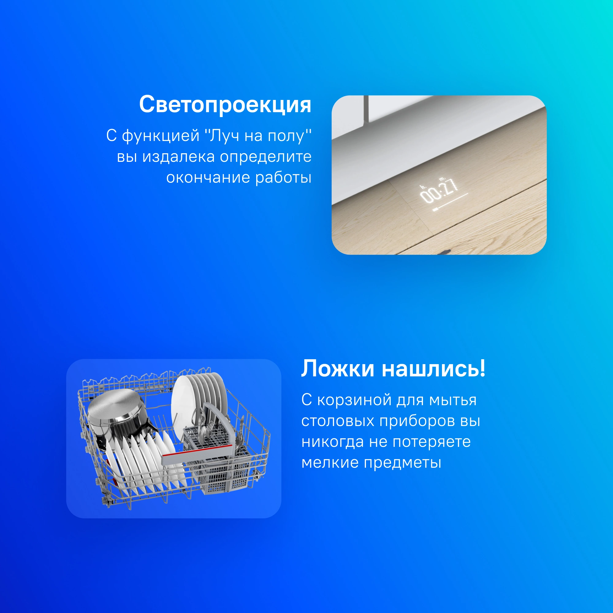| Индикация | времени до конца программы, луч на полу, наличия ополаскивателя, наличия соли, режима работы |