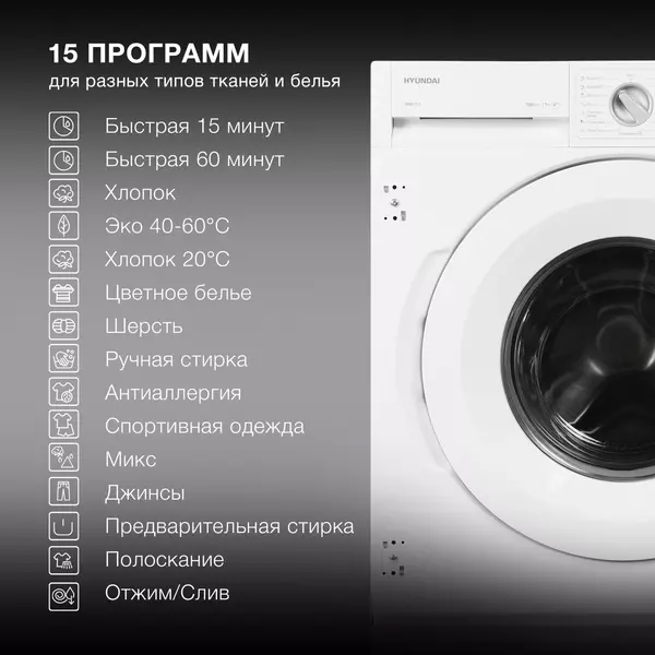 Хлопок, Эко 40-60, Предварительная стирка, Хлопок 20°C, Цветное белье, Шерсть, Полоскание, Антиаллергия, Отжим/Слив, Ручная стирка, Спортивная одежда, Микс, Джинсы, Быстрая 60’, Быстрая 15’