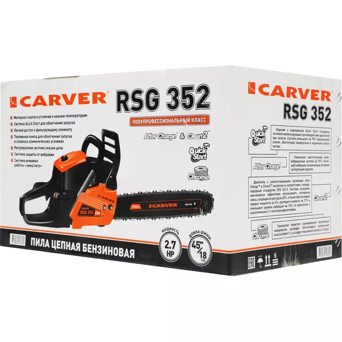 | Особенности | Система режимов работы зима/лето. Материал корпуса устойчив к низким температурам. Система Quick Start для облегчения запуска. Легкий доступ к фильтрующему элементу. Топливная помпа для облегчения запуска в сложных климатических условиях. Регулируемая система смазки цепи. Система защиты от вибрации. |