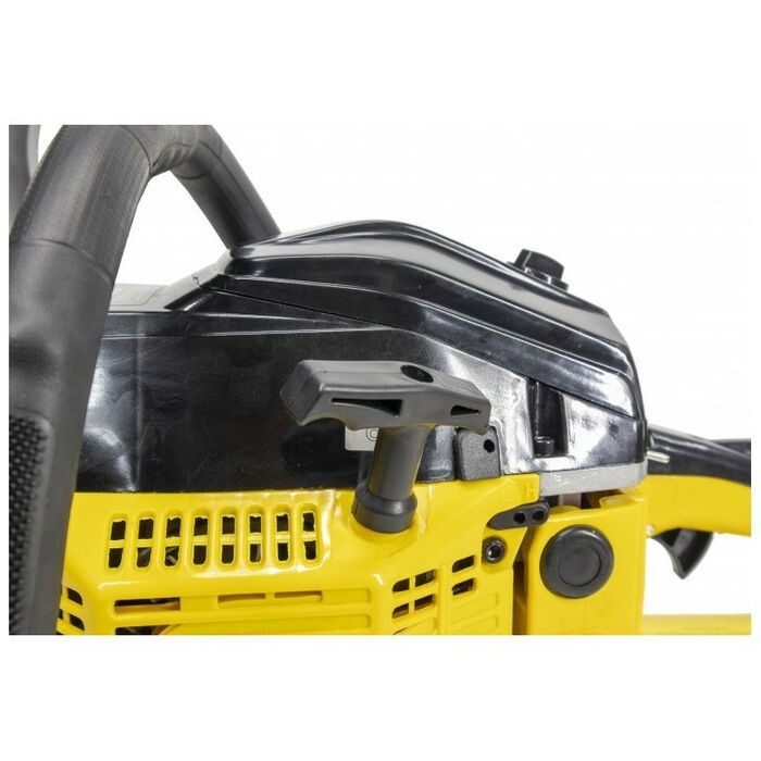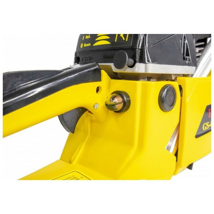 - Особое внимание уделено безопасности. За счет специальной кнопки бензиновой цепной пилы обеспечивается блокировка от случайного включения.