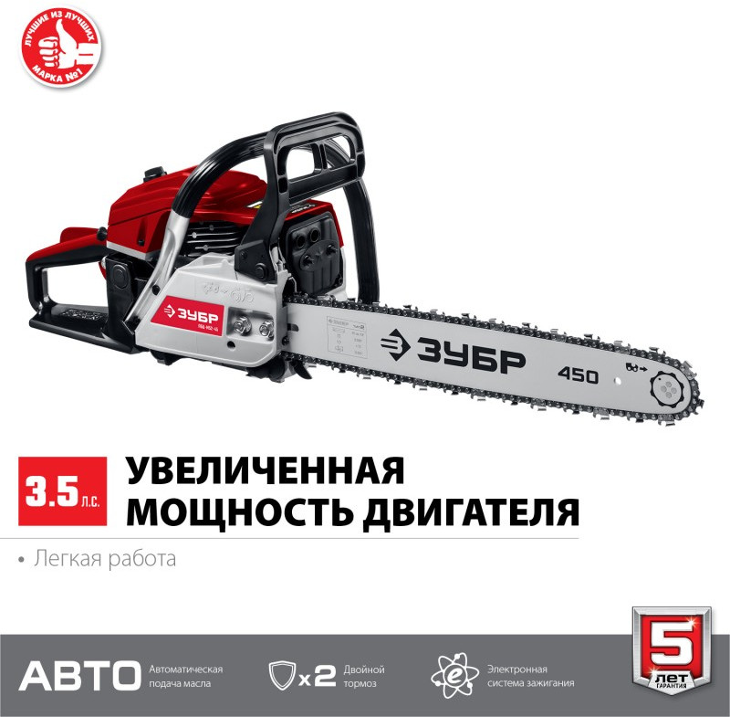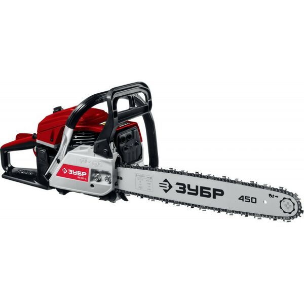 - Идеальный вариант для пиления досок, бруса, стволов различных пород дерева на дачном участке. В отличие от электрической, бензиновая пила оснащена более мощным двигателем, безопасна в отношении поражения электрическим током, может работать в любую погоду и в любом месте. Функции легкого запуска, автоматической смазки цепи и эффективная антивибрационная защита делают пилу легкой в обращении и комфортной в работе. Двойной тормоз цепи, приводимый в действие при откидывании защитного щитка или при отпускании клавиши блокировки на рукоятке, а также встроенный цепеуловитель и металлический упор делают пилу безопасной в применении. Большая удельная мощность, высокое качество применяемых материалов и изготовления, обеспечивающие увеличенный ресурс, делают бензиновую пилу ЗУБР Вашим лучшим помощником. Обратите внимание, что рекомендуемая пильная гарнитура ЗУБР устанавливается только комплектом