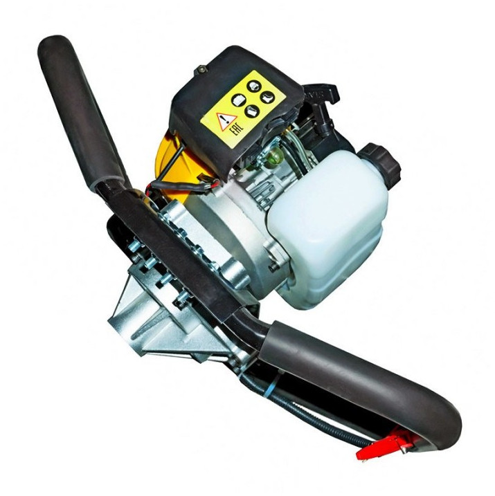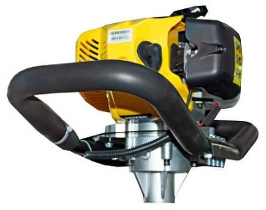 - Конструкция мотобура состоит из двигателя с топливным баком, укрепленных на раме. К ней прикрепляются ручки, с помощью которых удобно держать агрегат в любом положении. Двигатель соединяется с выходным валом для крепления шнеков (приобретаются отдельно). Размер вала составляет 20 мм, поэтому с буром могут использоваться различные стандартные шнеки от 100 до 300 мм. При необходимости бурения глубоких лунок со шнеком может применяться удлинитель размером 750 или 1000 мм
