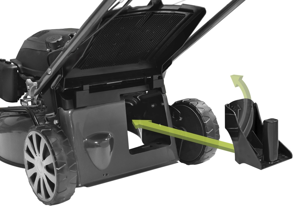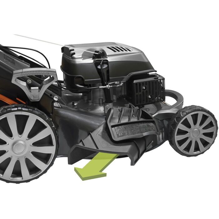 | Особенности | Три режима стрижки травы. Индикатор накопления травосборника. Система самоочистки AutoWash. Система измельчения травы для удобрения почвы. Вместительный травосборник 65 л. Центральный рычаг регулировки высоты скашивания. Регулируемая складная рукоятка. Прочная стальная дека. |
