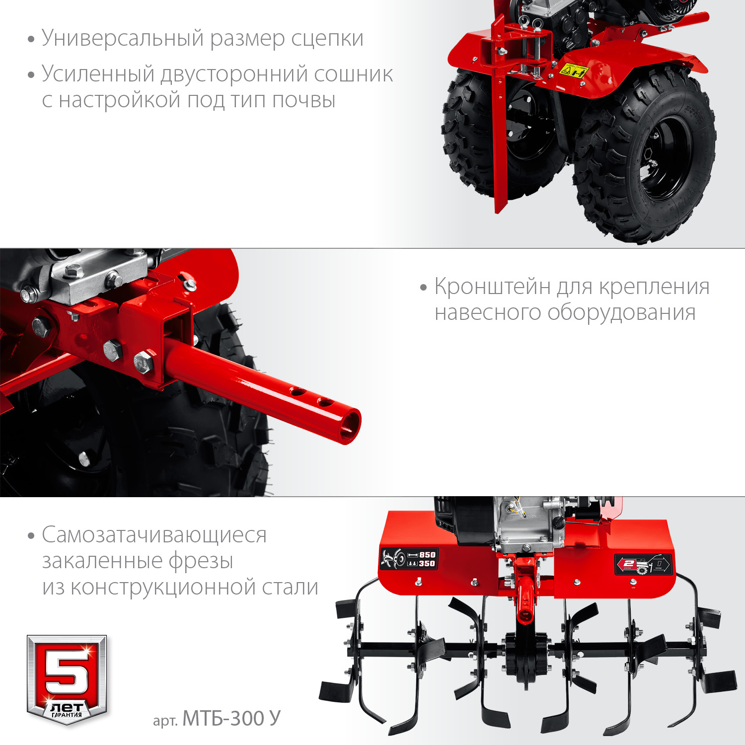 - Универсальная сцепка позволяет использовать различное навесное оборудование