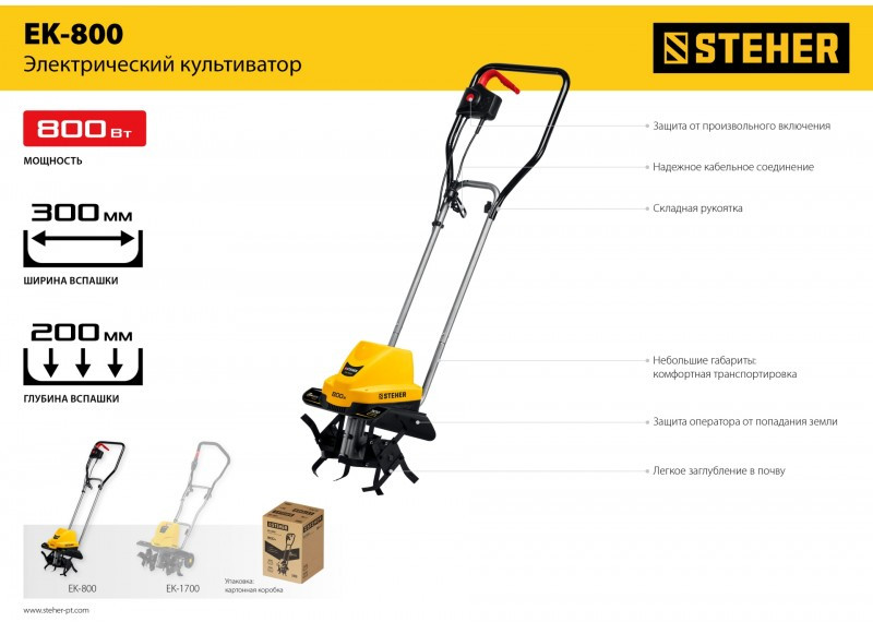 Лёгкий культиватор с синхронным двигателем мощностью 800 Вт используется для рыхления и культивации почвы в парниках и теплицах. Оснащен металлическими фрезами с шириной захвата 30 см и обрабатывает почву на глубину до 20 см.