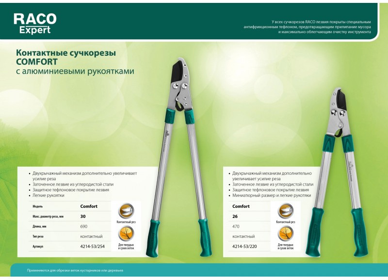 Сучкорезы RACO изготовлены из современных и качественных материалов. Благодаря специальному антифрикционному тефлоновому покрытию лезвий и алюминиевым рукояткам инструменты удобны в работе, идеально срезают ветки и обладают длительным сроком службы.