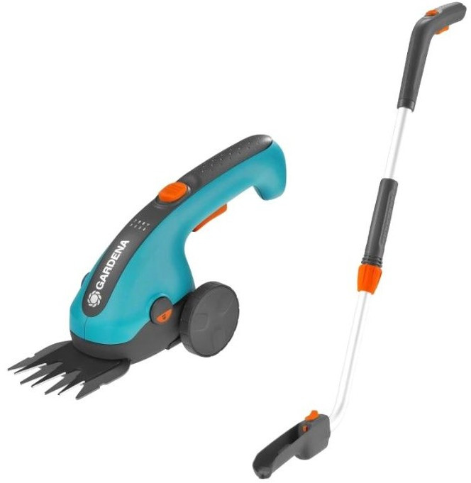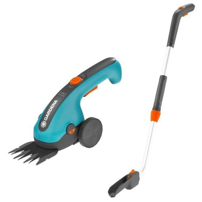 - Легкие ручные электрические аккумуляторные ножницы для стрижки травы, укомплектованные поворотной телескопической рукояткой Gardena и специальными фирменными колесами для стрижки газонов