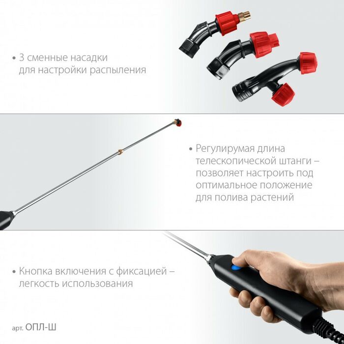 Компактный аккумуляторный опрыскиватель отличается эффективностью, мобильностью, экологичностью. Бережно орошает растения. Подходит для дезинфекции, мытья окон и стен. Работает от Li-ion аккумулятора.