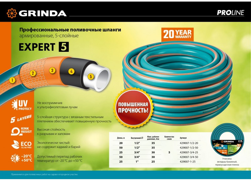 • Профессиональные шланги серии GRINDA PRO-LINE EXPERT 5 отличаются особой прочностью и надёжностью. При этом сохраняют гибкость и эластичность в широчайшем температурном диапазоне. Не перегибаются и не перекручиваются при использовании. Защищены от ультрафиолетовых лучей и не содержат вредных для окружающей среды тяжёлых металлов.