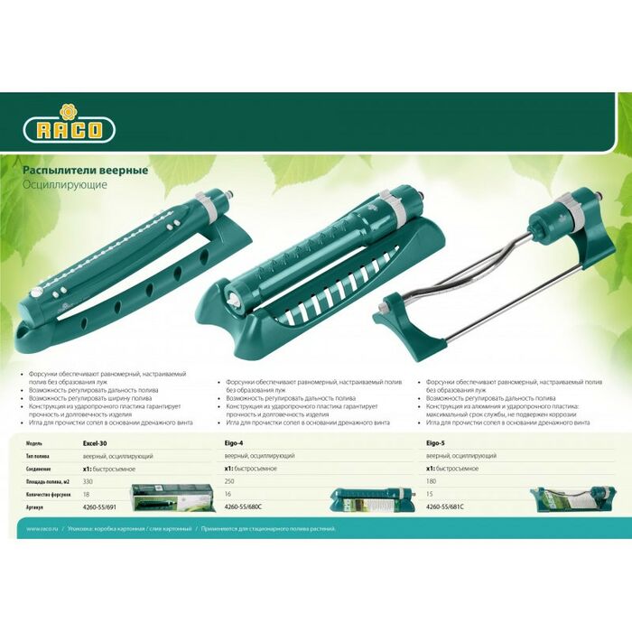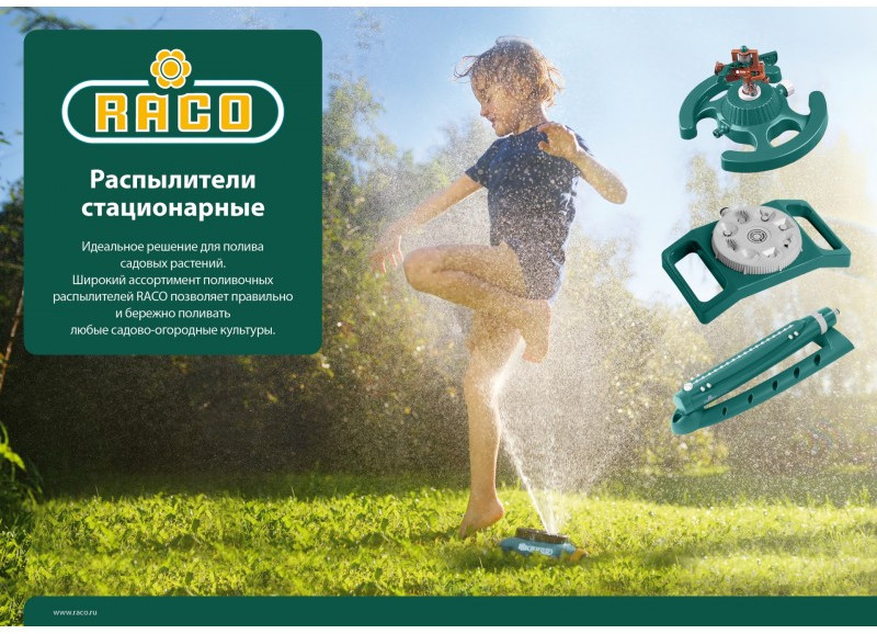 - Осциллирующие распылители RACO обладают высоким уровнем качества, широкой возможностью регулировки площади полива, и встроенным фильтром. Надёжны в работе, служат долго, исключительно удобны в использовании. Обеспечивают простое и качественное подключение к поливочной системе. Снабжены специальной иглой для прочистки форсунок.