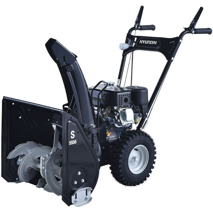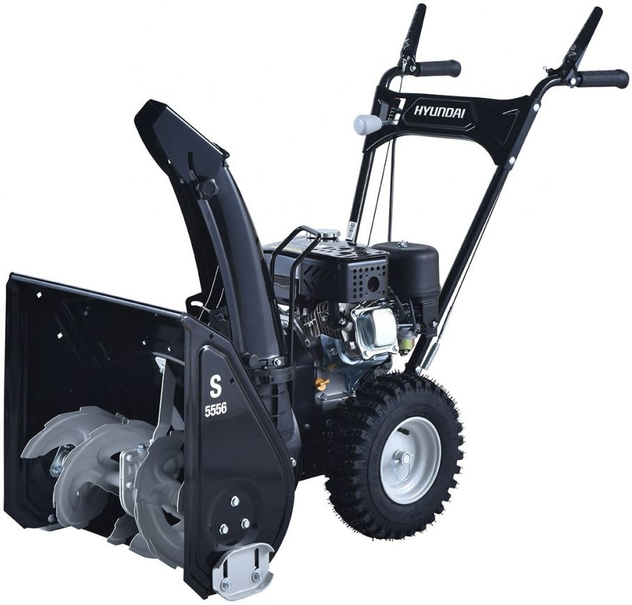Снегоуборщик бензиновый Hyundai S 5556. Агрегат используется для очистки от снега небольших по площади территорий - автостоянок, парковок, подъездных дорожек. Металлический шнек имеет специальные зубчики для переработки снежной корки или наледи. Направление и дальность выброса снега регулируются.