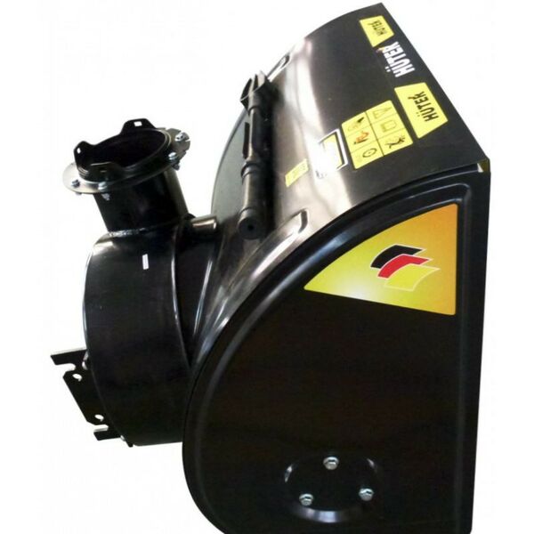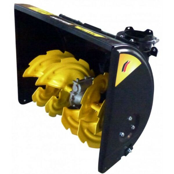 - Конструкция насадки состоит из снегоуборочного ковша с металлическим шнеком и желобом для выброса снега. На желобе есть ручка регулировки направления и высоты выброса снега