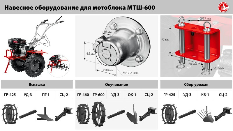 - Универсальная сцепка позволяет использовать различное навесное оборудование