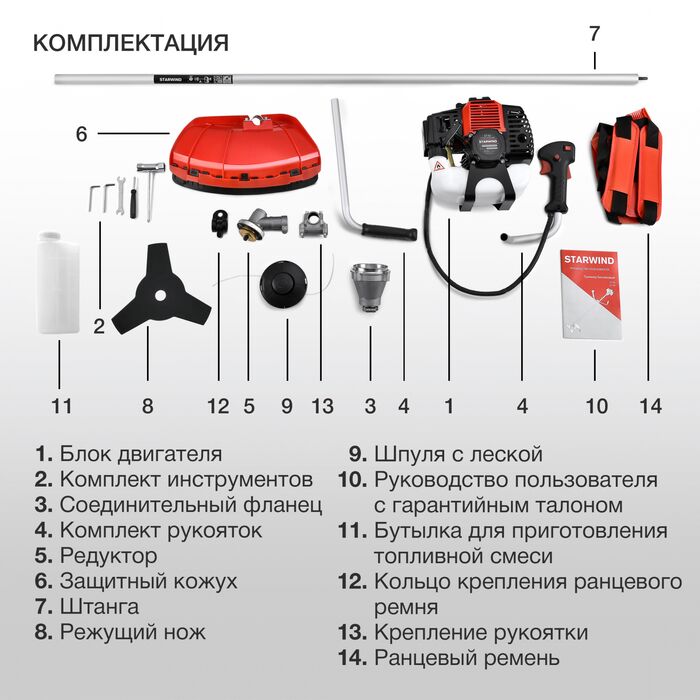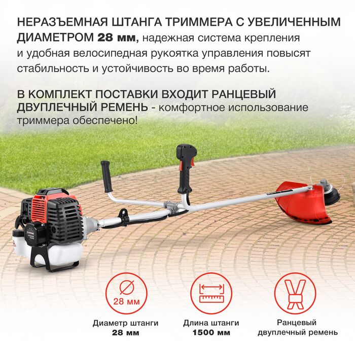 | Комплект поставки | "Блок двигателя,Штанга,Комплект крепежа,Комплект рукояток,Ранцевый ремень,Защитный кожух,Бутылка,Нож,Шпуля с леской" |
