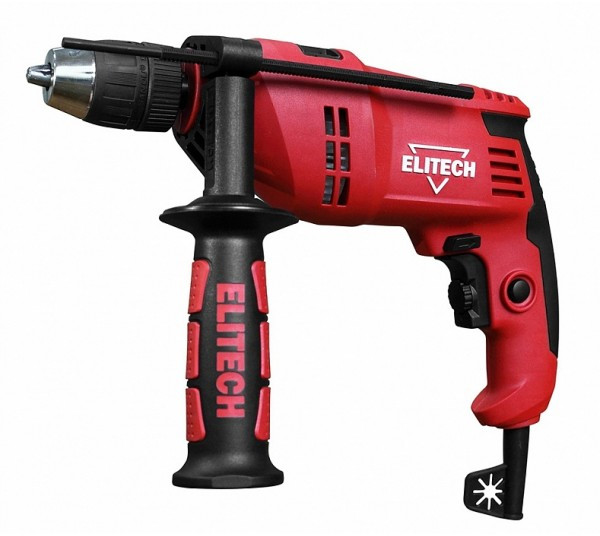 Дрель ударная Elitech ДУ 800РЭК мощностью 800 Вт. Работает от сети. Предусмотрена функция ограничения сверления.