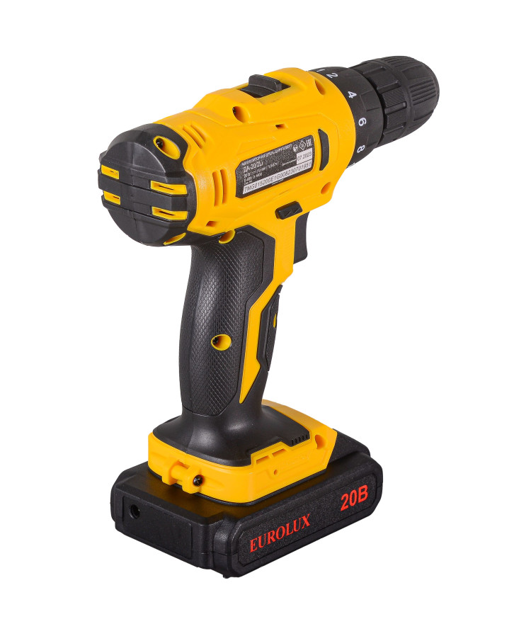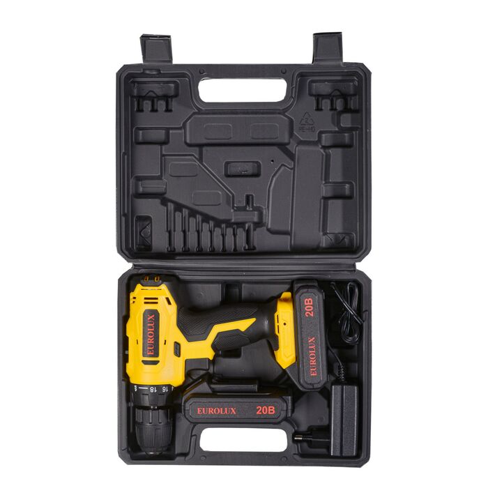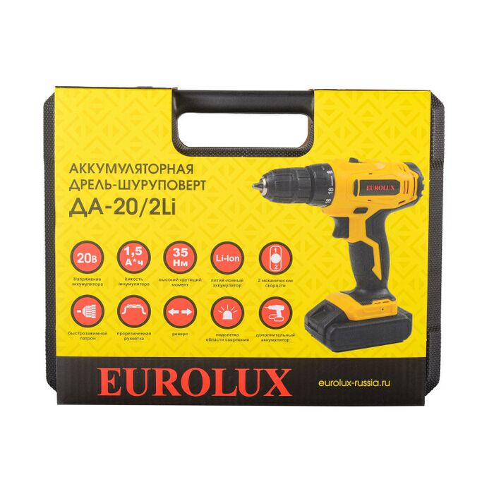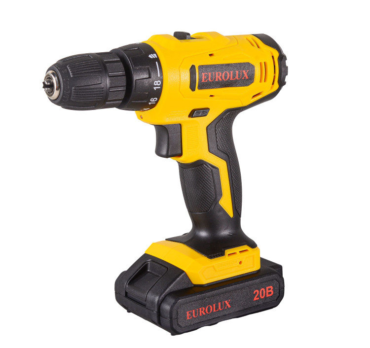 Аккумуляторная дрель-шуруповерт Eurolux ДА-20/2Li – ручной электроинструмент с регулируемым крутящим моментом, предназначенный для закручивания и откручивания шурупов, саморезов, винтов и других видов крепежных изделий, а также сверления отверстий в различных конструкционных материалах.