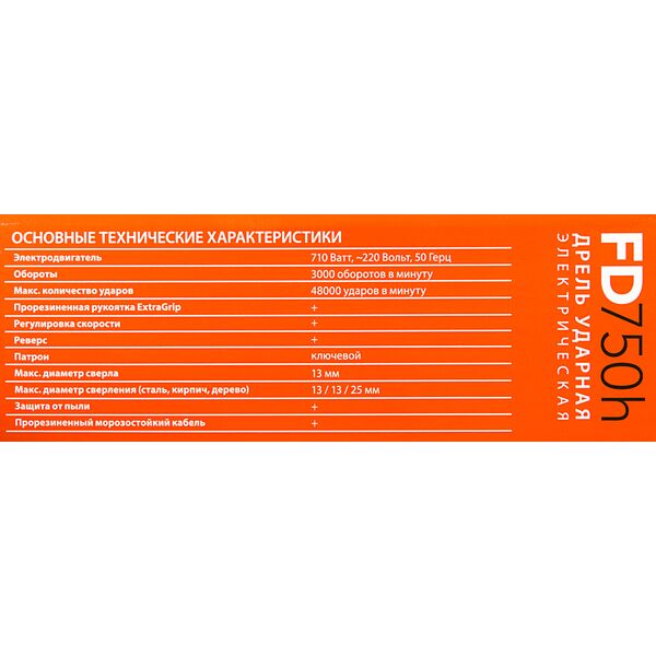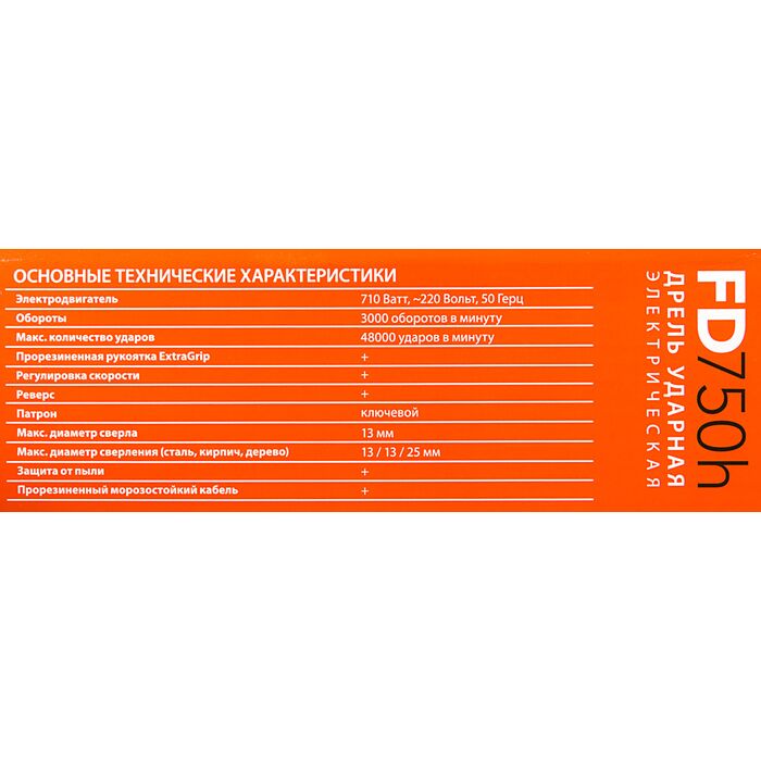 | Комплект поставки | Дрель ударная, дополнительная рукоятка, ограничитель глубины сверления, запасные щетки, инструкция по эксплуатации. |