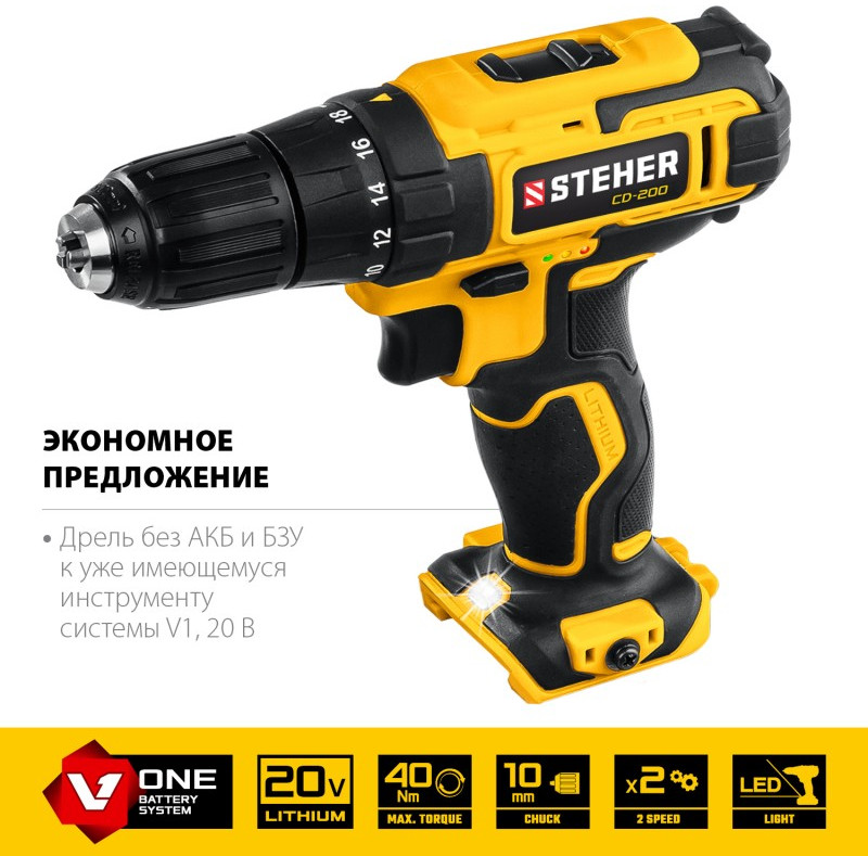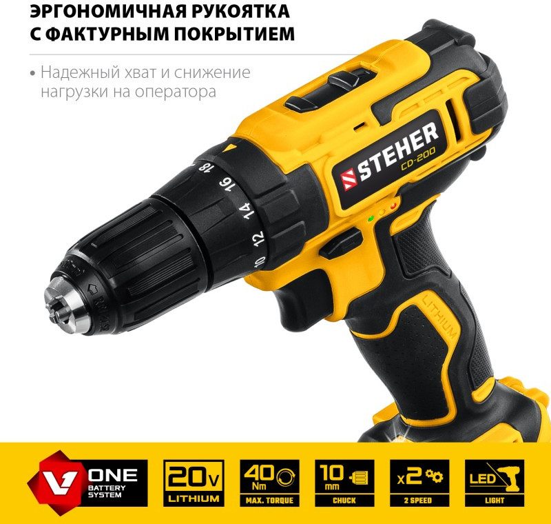 - Новый недорогой шуруповерт Steher - помощник в сверлении и заворачивании. Индивидуальный дизайн, удобная эргономика, высокие скорость и крутящий момент обеспечивают комфортную и производительную работу. Очень выгодное предложение для имеющих инструменты серии V-ONE. ″Мягкая″ муфта с минимальным крутящим моментом 0.2 Нм позволяет работать с компьютерными винтиками или мебельной отделкой