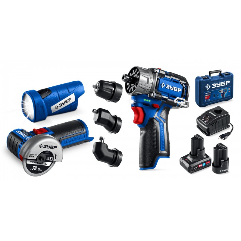- Набор из дрели-шуруповерта с комплектом сменных патронов для различных работ, углошлифовальной машины для резки и сверхъяркого фонаря