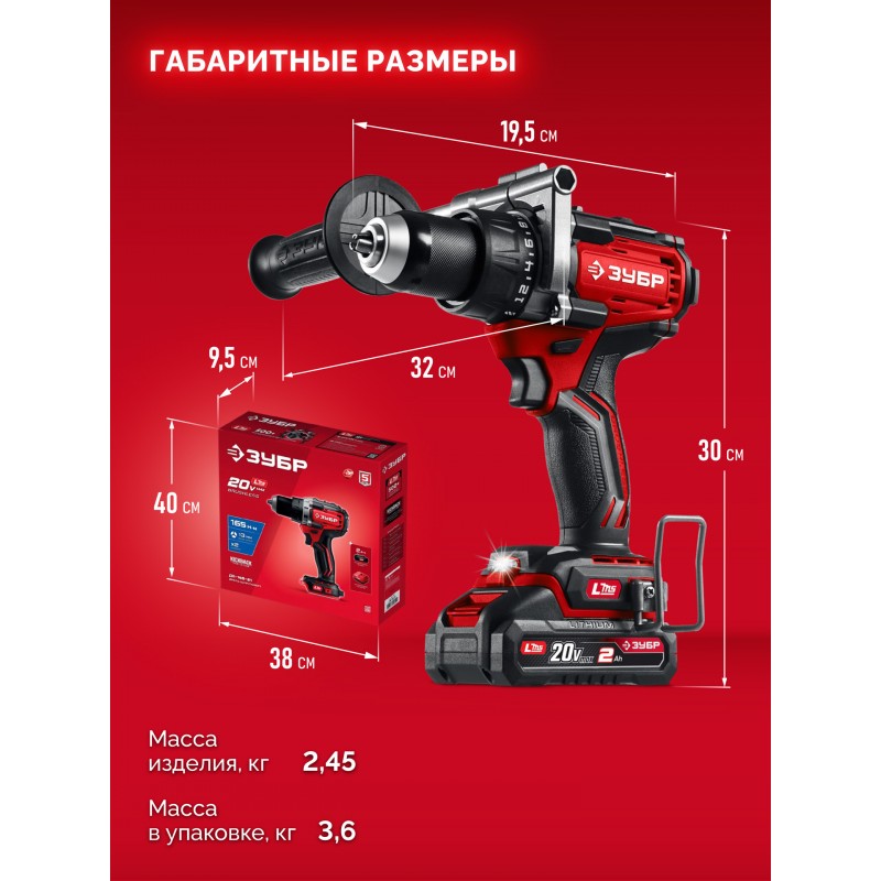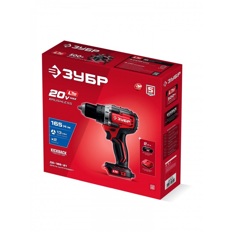 Бесщеточная дрель-шуруповерт ЗУБР системы LMS с максимальным крутящим моментом 165 Нм предназначена для работы с самым крупным крепежом (саморезы до 12 мм диаметром) и сверления отверстий до 40 мм в дереве. Встроенная защита от обратного удара предотвращает повреждение кисти при резкой блокировке вала. Комплектация с аккумулятором позволяет начать работу сразу после покупки