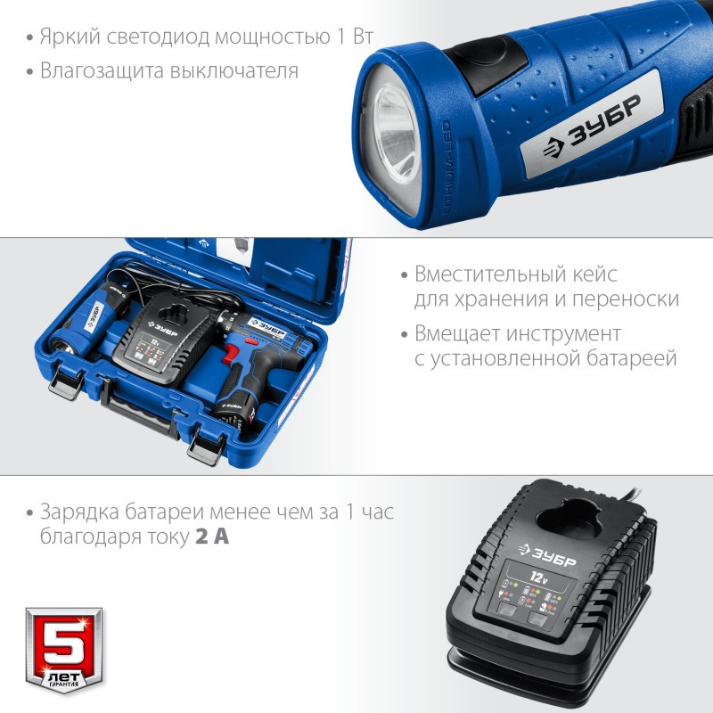 Дрель-шуруповерт Зубр DL-121-22F Профессионал 12В + LED фонарь, 2 АКБ (2Ач), в кейсе