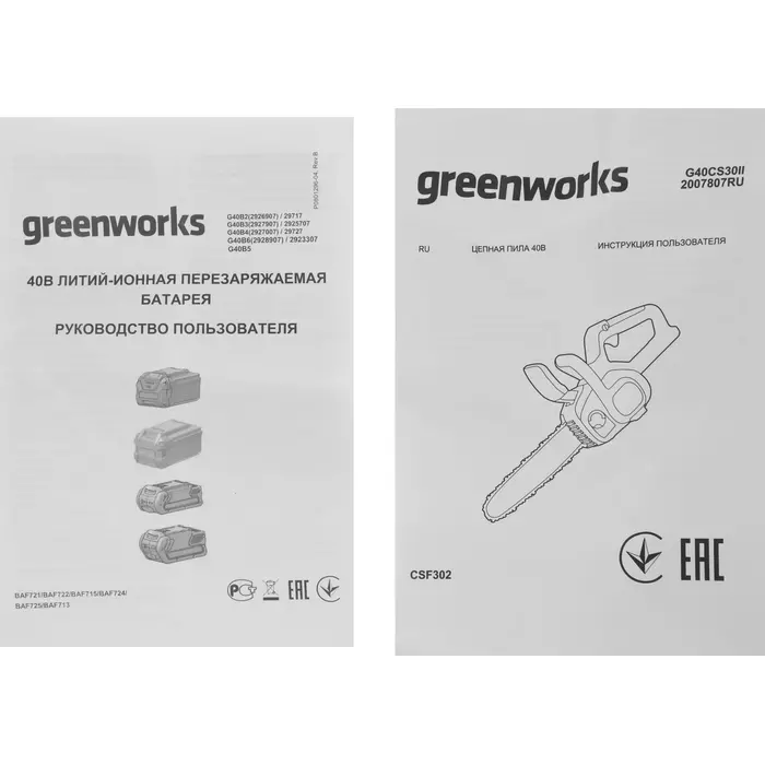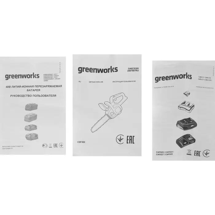 | Комплектация | Аккумуляторная цепная пила 30 см. арт. 2007807; аккумулятор Greenworks 40V 2A*ч.; зарядное устройство Greenworks 40V;руководство по эксплуатации; гарантийный талон. |