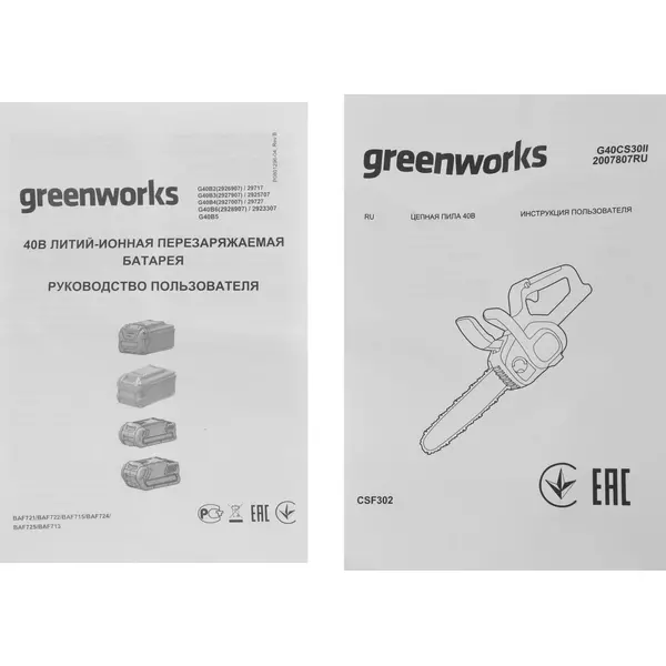 | Комплектация | Аккумуляторная цепная пила 30 см. арт. 2007807; аккумулятор Greenworks 40V 2A*ч.; зарядное устройство Greenworks 40V;руководство по эксплуатации; гарантийный талон. |