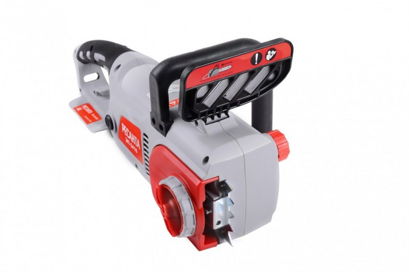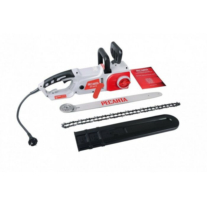 - Отличительными особенностями электропилы Ресанта являются простота и удобство в работе, ведь она не требует заправки топливом и работает от сети 220В. Также стоит отметить низкий уровень шума, создаваемый при работе, а также полное отсутствие выхлопных газов. Это означает, что вы можете использовать пилу не только на улице, но и в помещении при ремонтных и строительных работах. Вы можете легко регулировать натяжение цепи с помощью винта, расположенного на корпусе справа. К характеристикам, обеспечивающим комфортное пользование инструментом, также можно отнести автоматическую смазку цепи. Чтобы вы смогли определить уровень смазки для цепи, в корпусе есть смотровое окошко с делениями. Единственная особенность - это недостаточная мобильность, ведь пользоваться инструментом можно только в непосредственной близости от розетки переменного тока 220В. Этот легко исправить, используя переноску (с кабелем подходящего сечения!) или бензогенератор Ресанта. Для электропилы ЭП-2418 подойдут цепи со следующими параметрами: количество звеньев 63, шаг цепи 3/8, толщина ведущего звена 1.3, шина 181E.