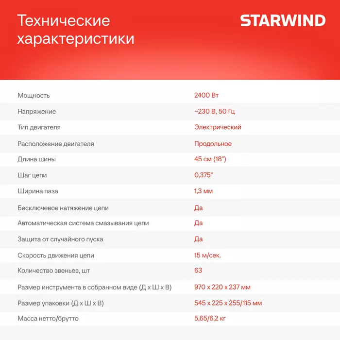| Длина пильной шины | 18" (45 см) |