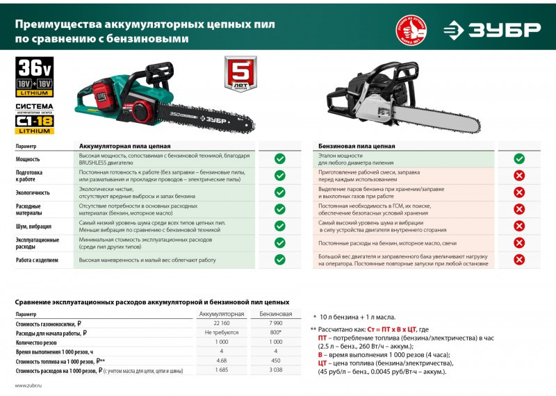 - Прекрасная альтернатива бензиновой и электрической пилам: отсутствие необходимости постоянной покупки ГСМ и контроля уровня топлива, нет опасности повредить провод и проблем с ограничением его длины, простота эксплуатации и ремонта, меньшие шум и вибрация и полное отсутствие вредных выбросов