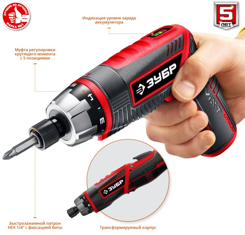 Инструмент для заворачивания/отворачивания крепежа с Li-Ion аккумулятором - незаменимый помощник в быту. Многофункциональность, мощность, удобство в эксплуатации, легкая замена инструмента, встроенная подсветка, настройка и трансформация под любой режим работы, большой набор сменного инструмента - неоспоримые преимущества отвертки ЗУБР