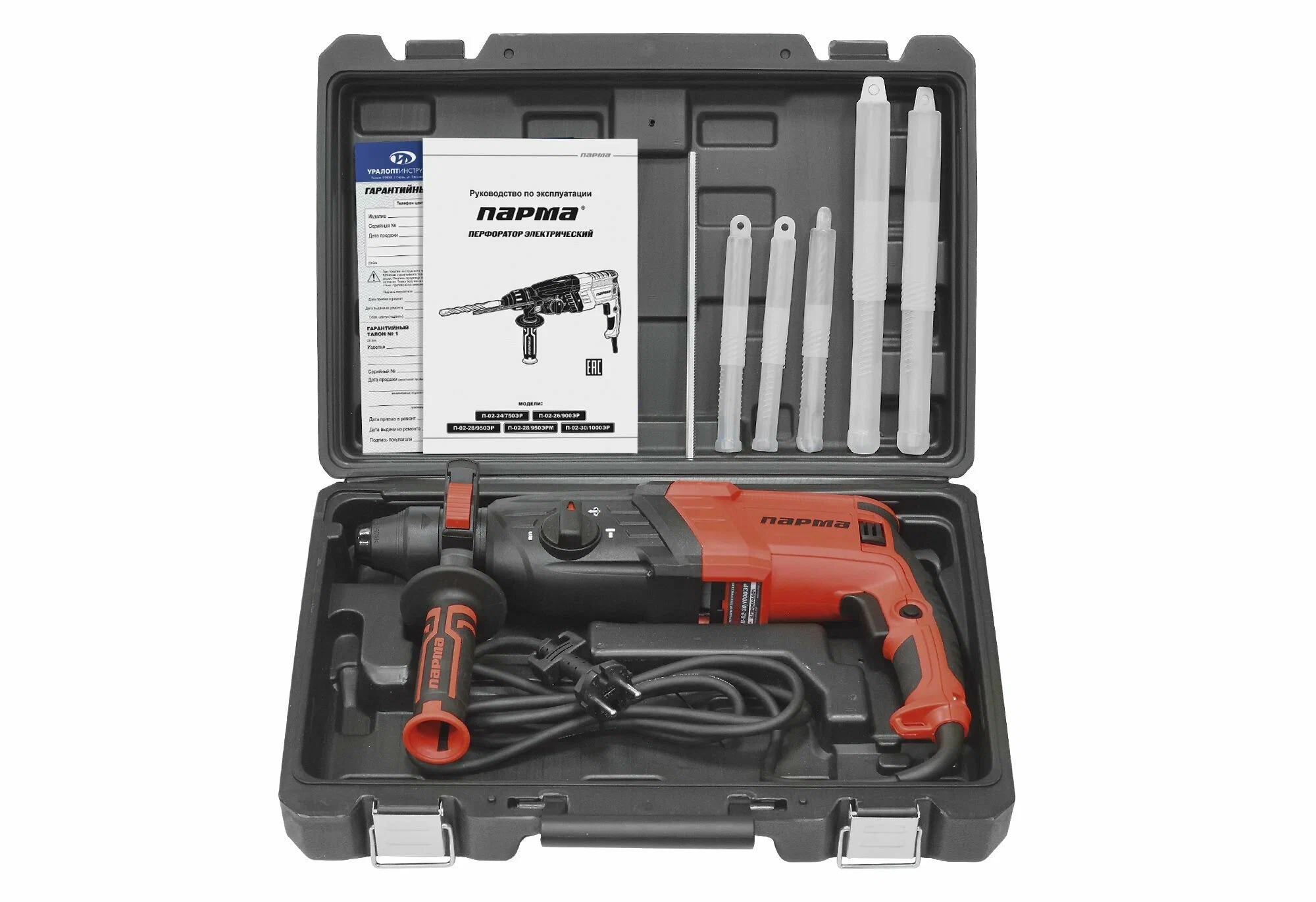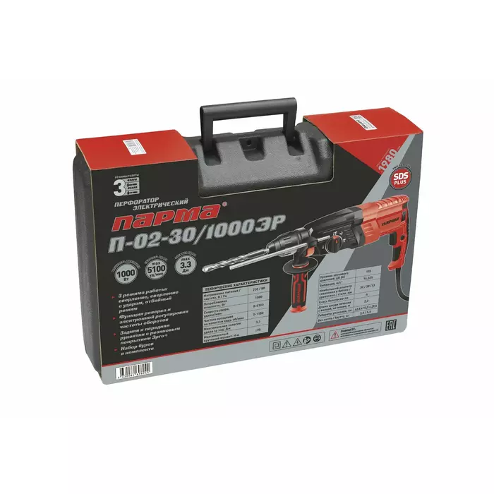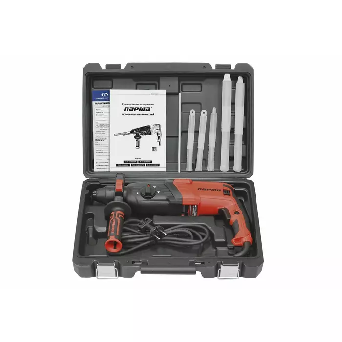 | Комплект поставки | Перфоратор, ограничитель глубины сверления, плоское долото, пика-долото, набор буров, руководство по эксплуатации, гарантийный талон, кейс. |