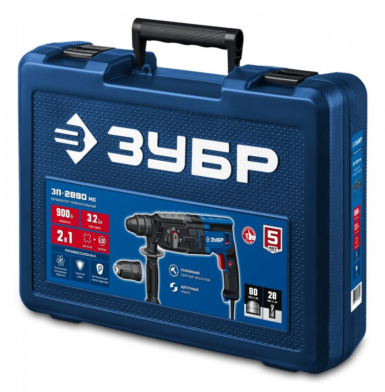 - Два патрона в комплекте - SDS Plus и быстрозажимной патрон для цилиндрических сверл с быстрой их сменой