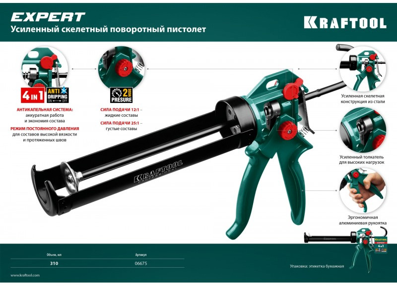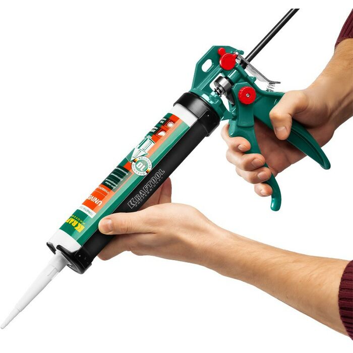 Пистолет для герметиков подходит для работы с картриджами объемом 310 мл, имеет усиленную скелетную конструкцию из стали, ручку из алюминиевого сплава, которые способствуют равномерной подачи клея либо герметика. Данная спецификация обеспечивает прочность и надежность конструкции пистолета при использовании.