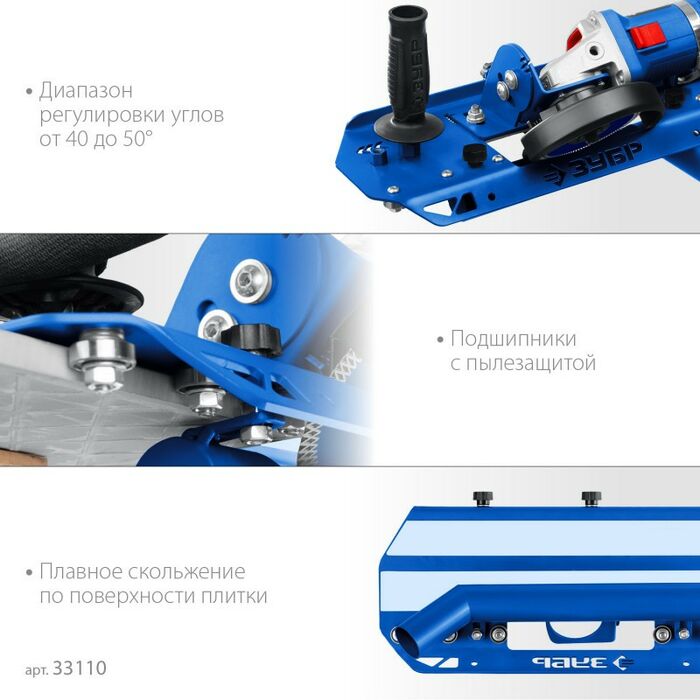 Заусовщик для плитки под 45° необходим для создания идеальной фаски на различных видах плиток от керамических, до плиток из натурального камня. В комплекте идут крепления под все виды УШМ марки ЗУБР, а также универсальное для УШМ других марок. Имеет возможность подключения пылесоса к пылеотводу. Быстрая установка и легкая настройка положения. 6 подшипников с пылеотводом вместе со скользящими накладками обеспечивают плавное скольжение по поверхности плитки в процессе работы.