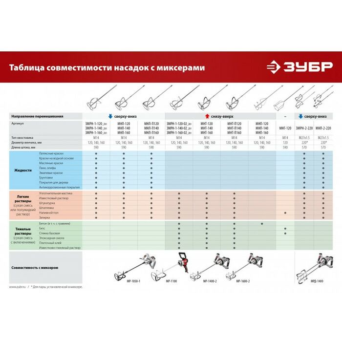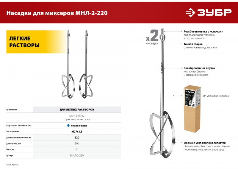 - Комплект насадок предназначен для установки в ручной миксер ЗУБР ЗМР-1350Э-2, МРД-1400. Прочная металлическая конструкция позволяет размешивать густые тяжелые смеси. Хвостовик данной насадки уникален и имеет «ключ» для исключения неправильной установки. В комплекте поставляется две насадки (левая, правая)