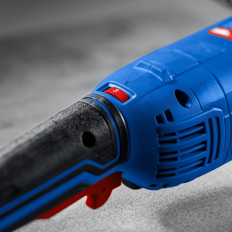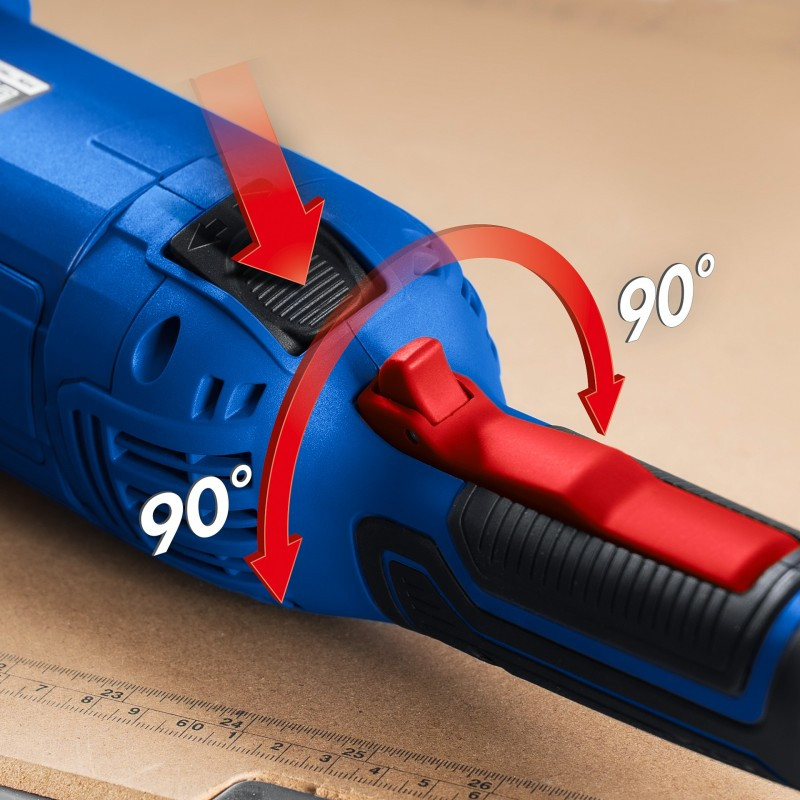 - Широкий эргономичный выключатель с пылезащитой, блокировкой непреднамеренного включения, а также фиксацией во включенном положении