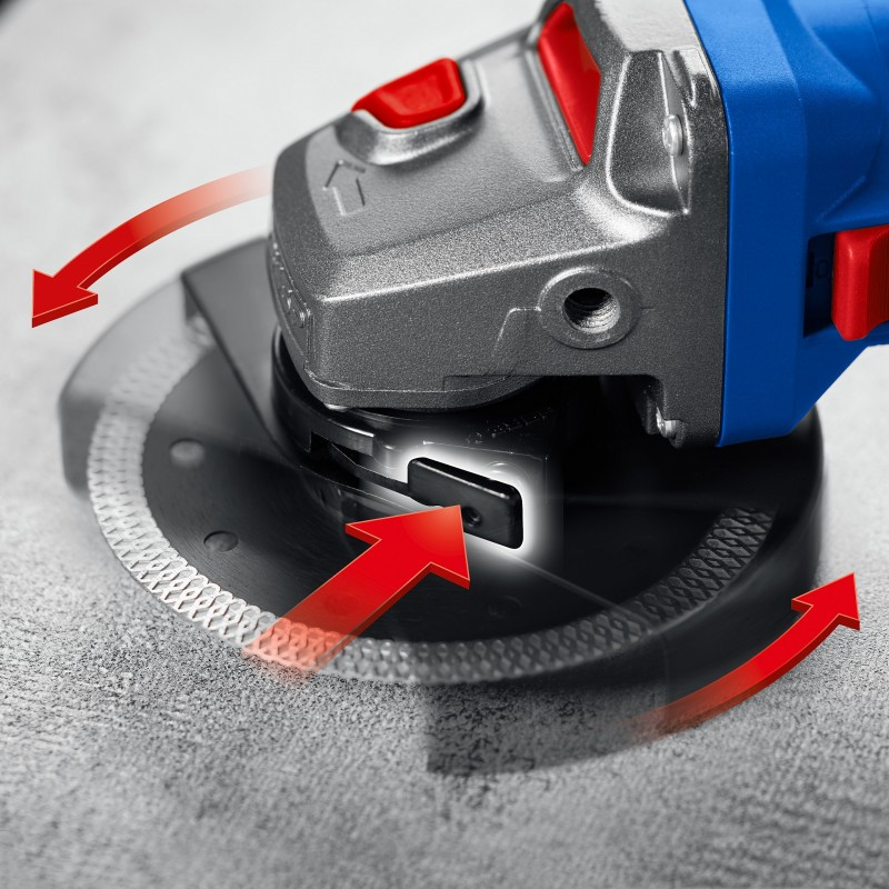 - защита - Kickback protection (защита от обратного удара) - эффективная защита оператора от рывка инструмента при резкой остановке диска (при заклинивании). Также предотвращает разрушение диска с разлетом осколков